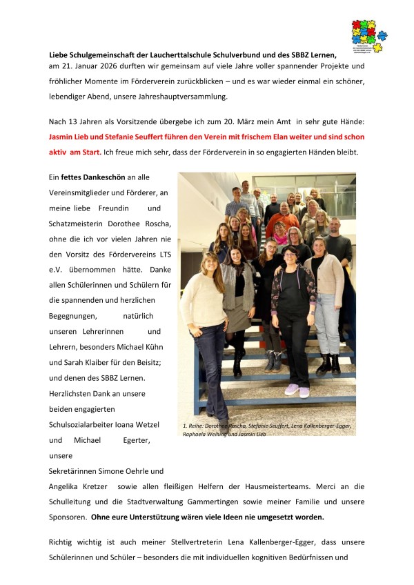 In heiterer Atmosphäre fand am 21. Januar 2026 die Jahreshauptversammlung des Fördervereins der Laucherttalschule e. V. statt. Von 160 eingeladenen Mitgliedern nahmen 22 Stimmberechtigte teil. Erstmals waren mit Schülersprecherin Leni Fink und ihrem Stellvertreter Rocco Mustapic auch zwei Vertreter der SMV als Gäste anwesend.