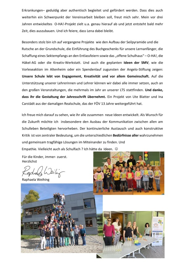 Auch die SMV brachte neue Projektvorschläge ein: eine Vorleseaktion im Altenheim sowie einen Spendenlauf zugunsten der Angelo-Stiftung für krebskranke Kinder sind angedacht. Der Förderverein sagte seine Unterstützung zu. Diese Vorhaben bieten zugleich einen guten Einstieg für die neue Vorstandsspitze. Eine sorgfältige Übergabe ist allen Beteiligten ein wichtiges Anliegen – ganz im Sinne des Mottos „Hand in Hand“.